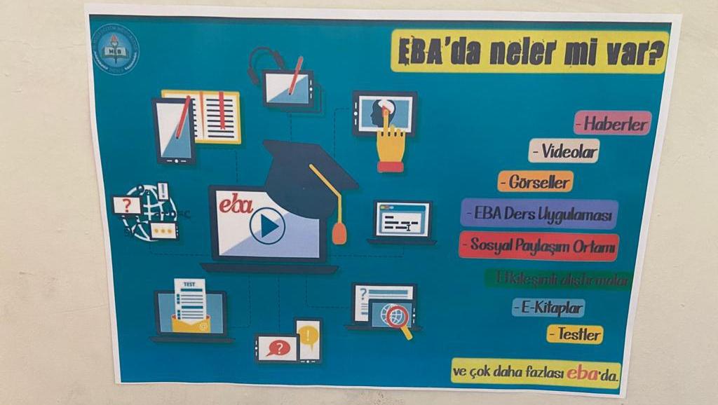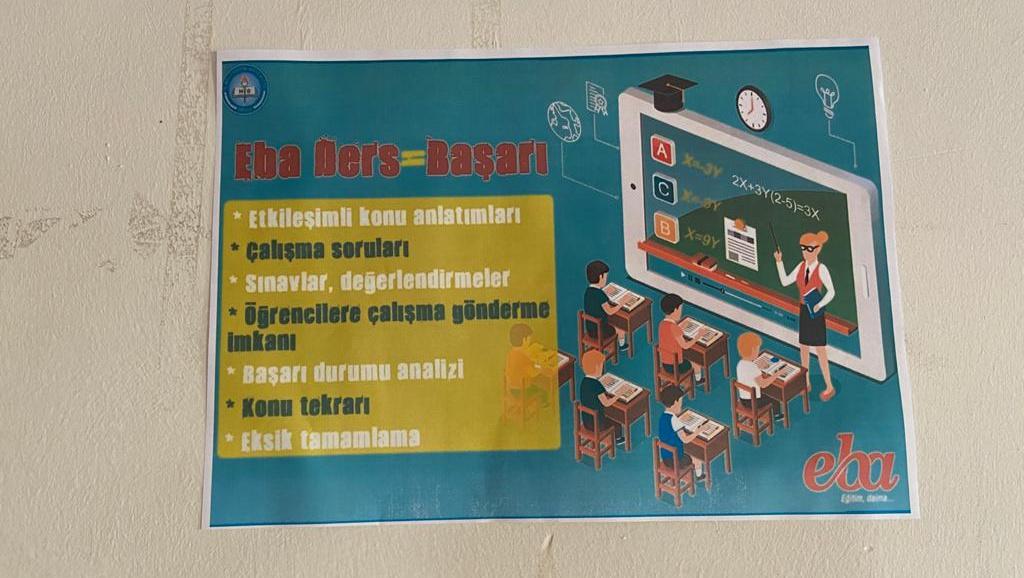 Pandemi sebebi ile eğitim-öğretim hayatımızın içinde olan uzaktan eğitim sisteminde en büyük yardımcı EBAdır.Öğrencilerimizi EBA kullanımında teşviklendirmek ve bilgilendirmek amacıyla okulumuz içerisinde afişlendirme çalışması yapılmıştır.